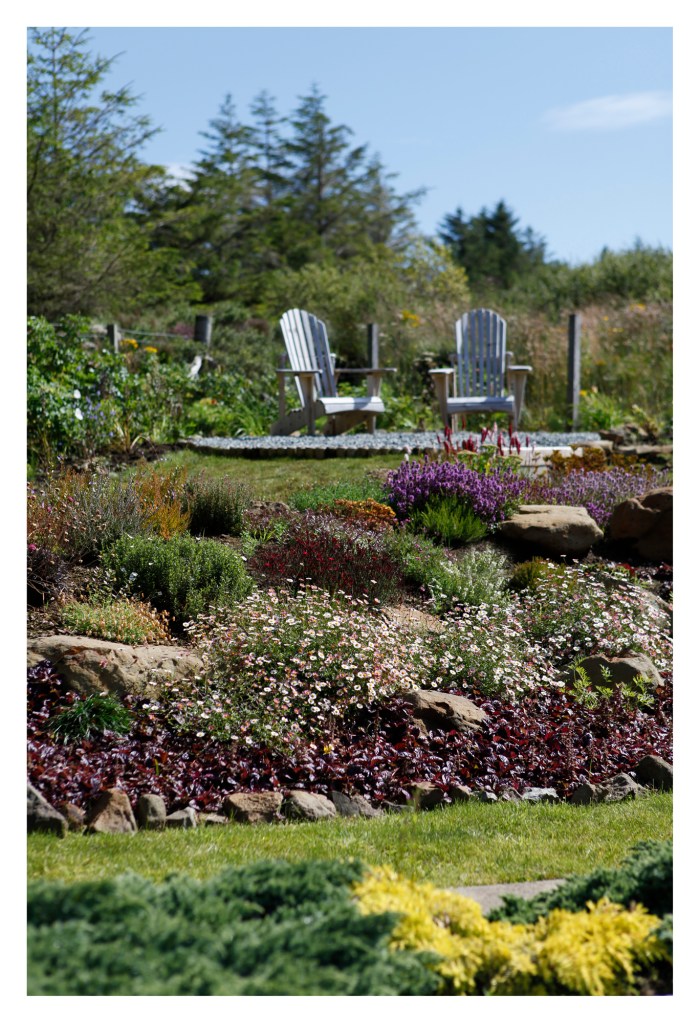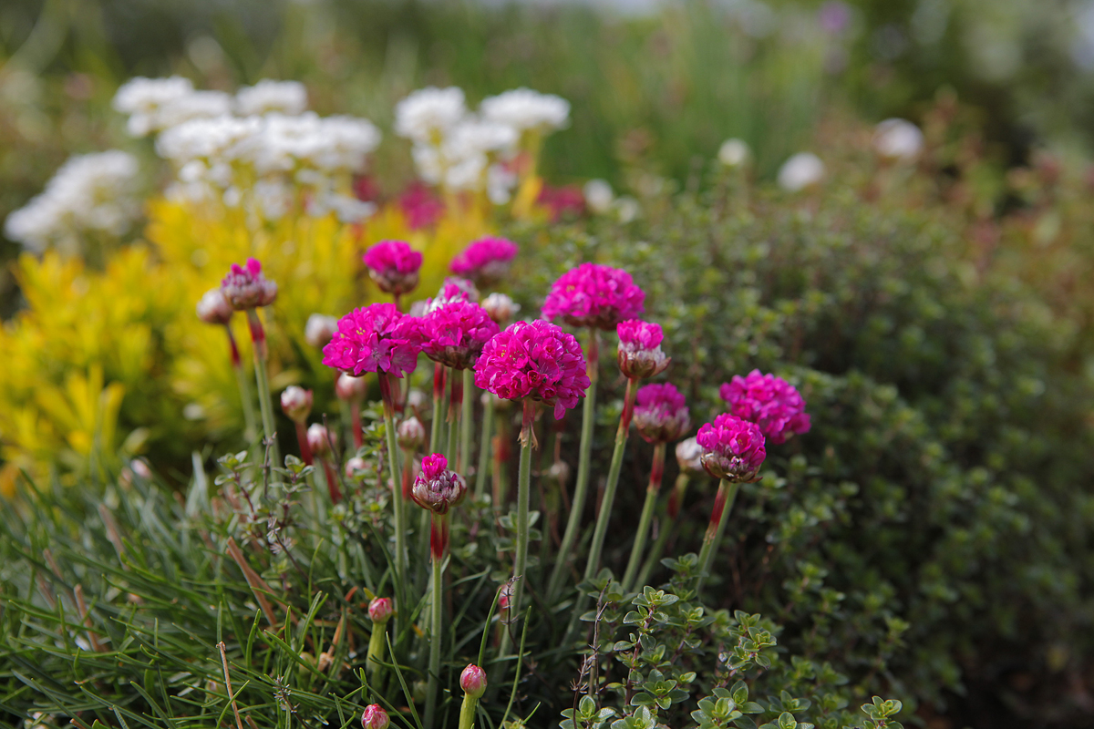 This is a two year old rockery, planted up with a selection of strong colours and clump forming herbs. There are still more plants to bloom a little further into the season bringing more colour and new interest for the rest of the year.