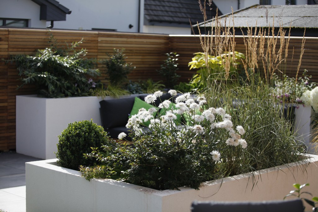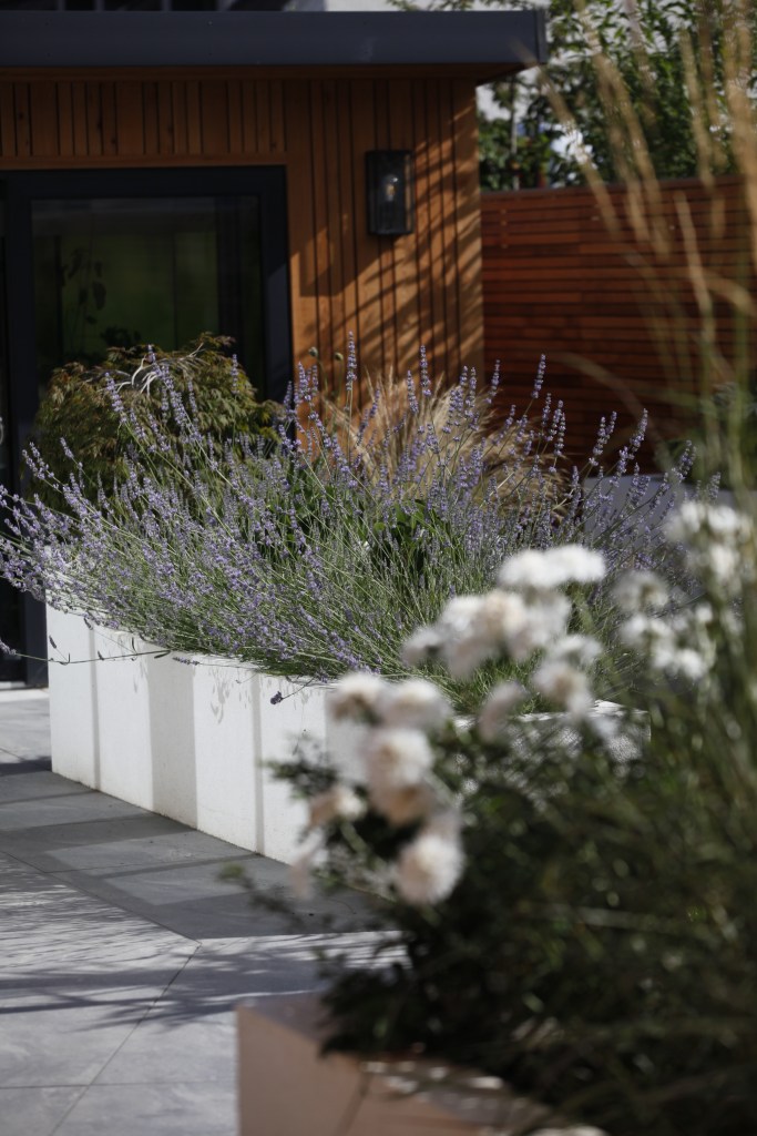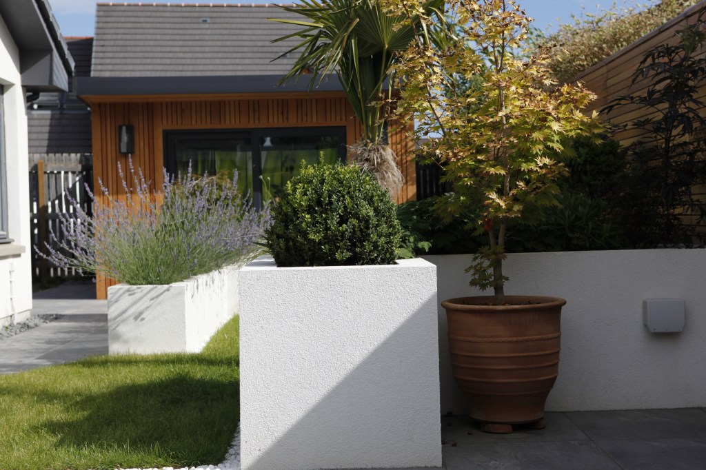 Garden spaces were created for a new “garden room”, productive garden, entertaining space with modern outdoor furniture and space for pizza oven, enclosed in beautiful planting in tall, off white rendered planters.