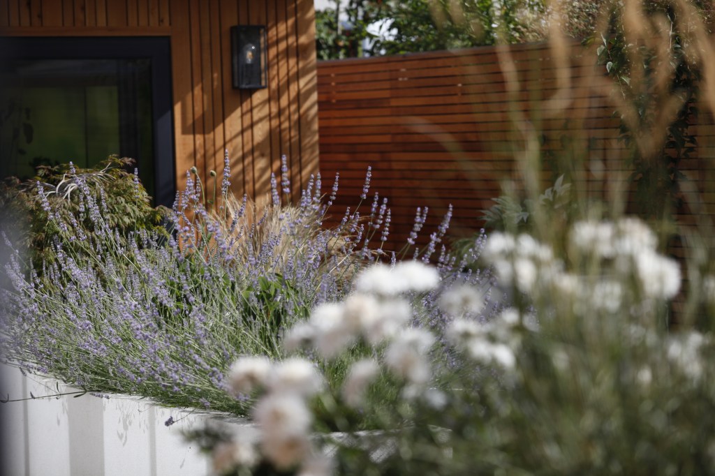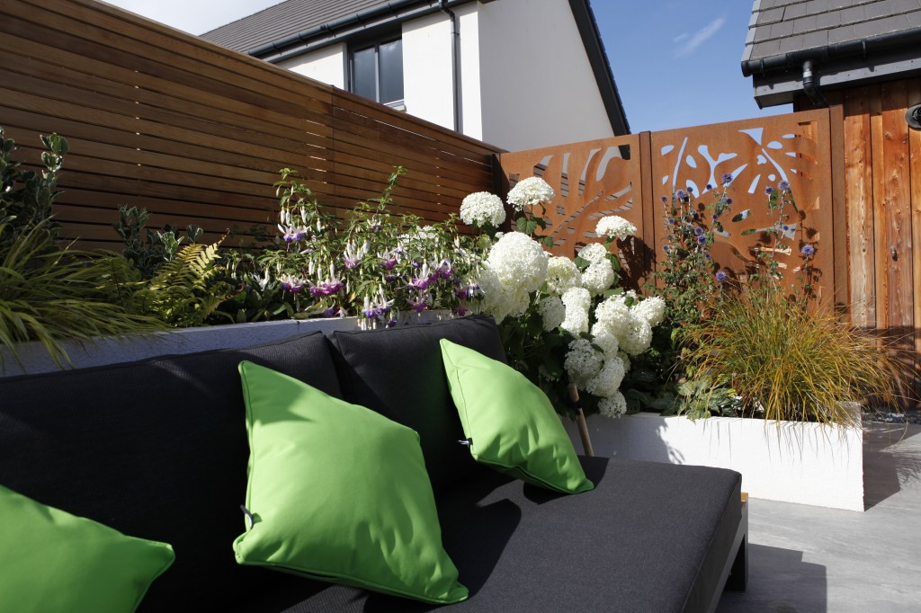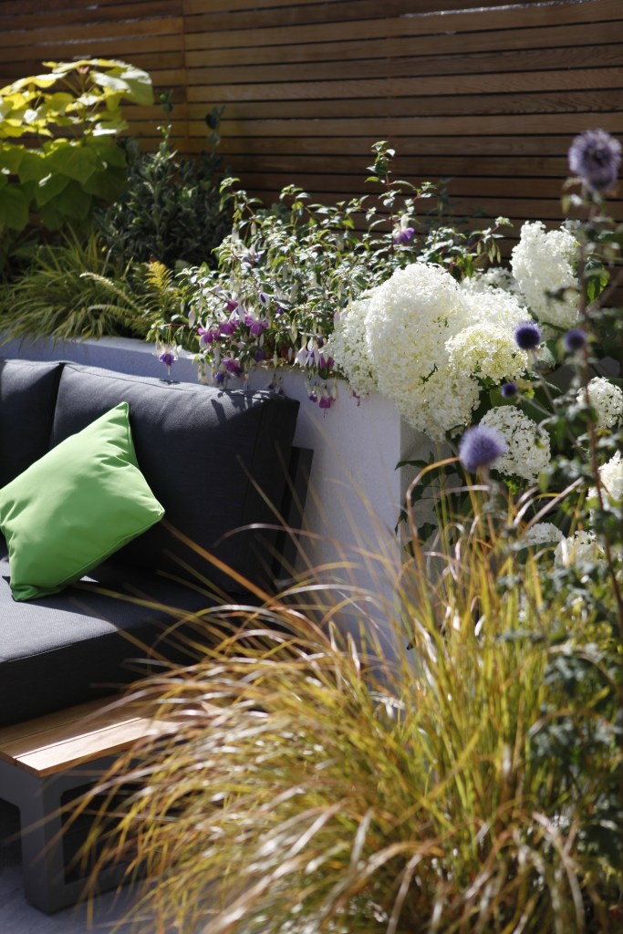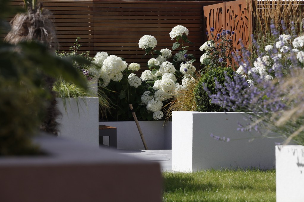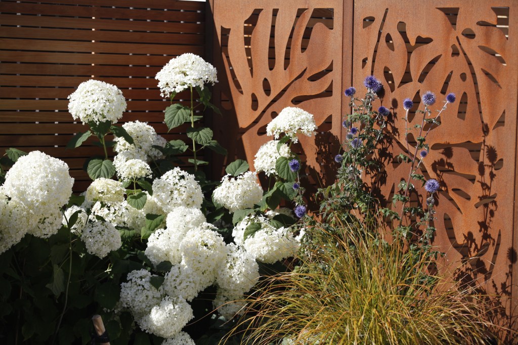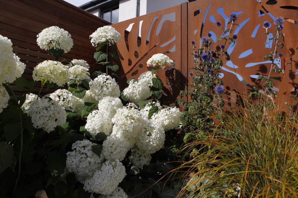 Stunning Corten steel dividing panel has been used to create the element of surprise and mystery as you approach the garden. The rusty colour is softened and complemented by the delicate white of Hydrangea arborescens ‘Annabelle’ and Echinops ritro.
