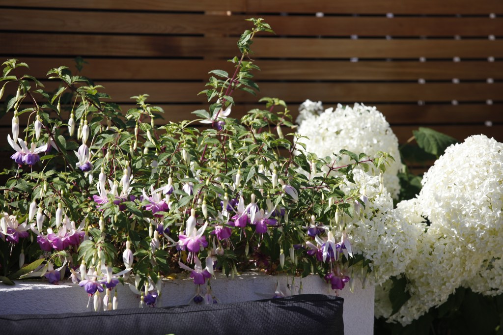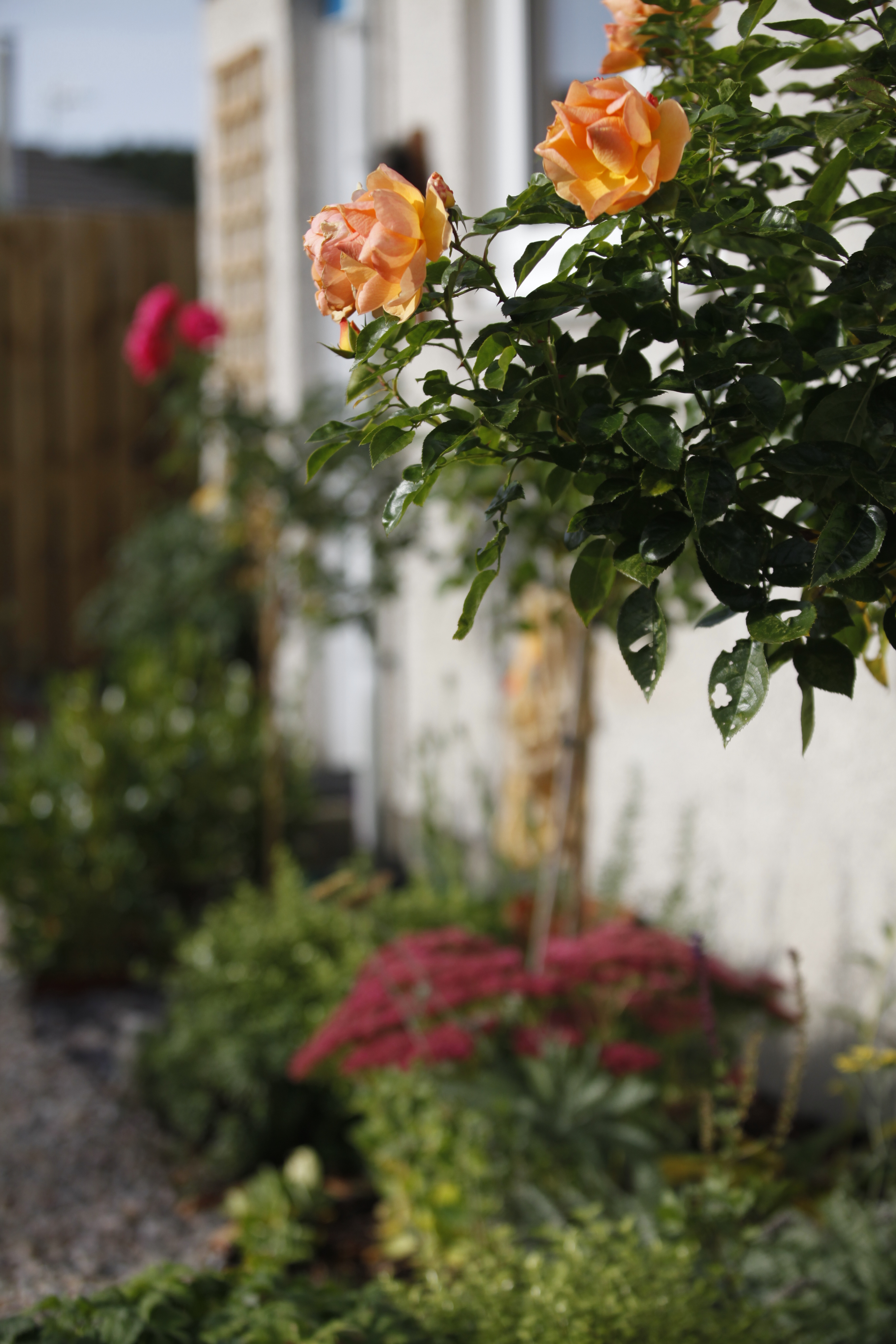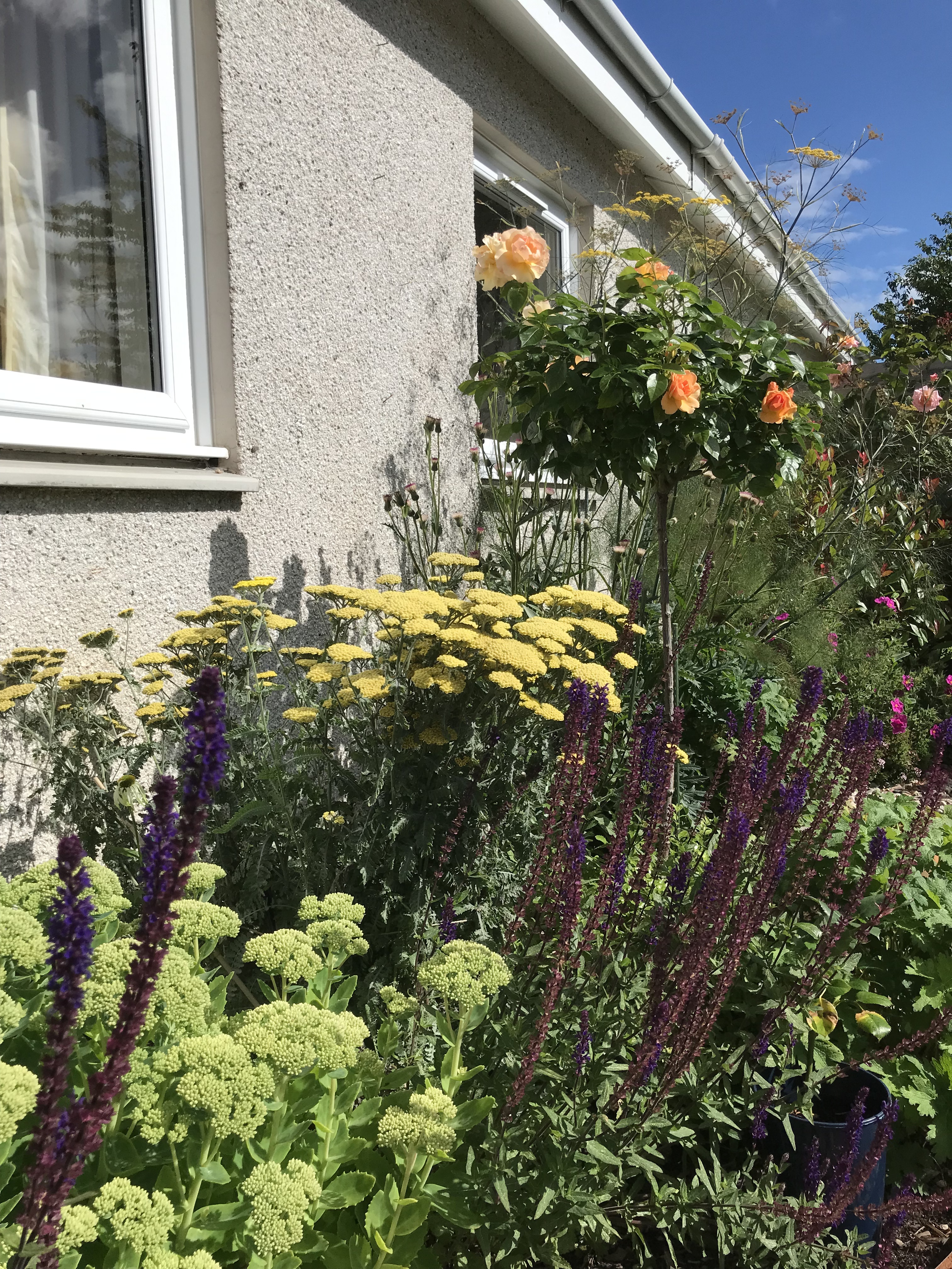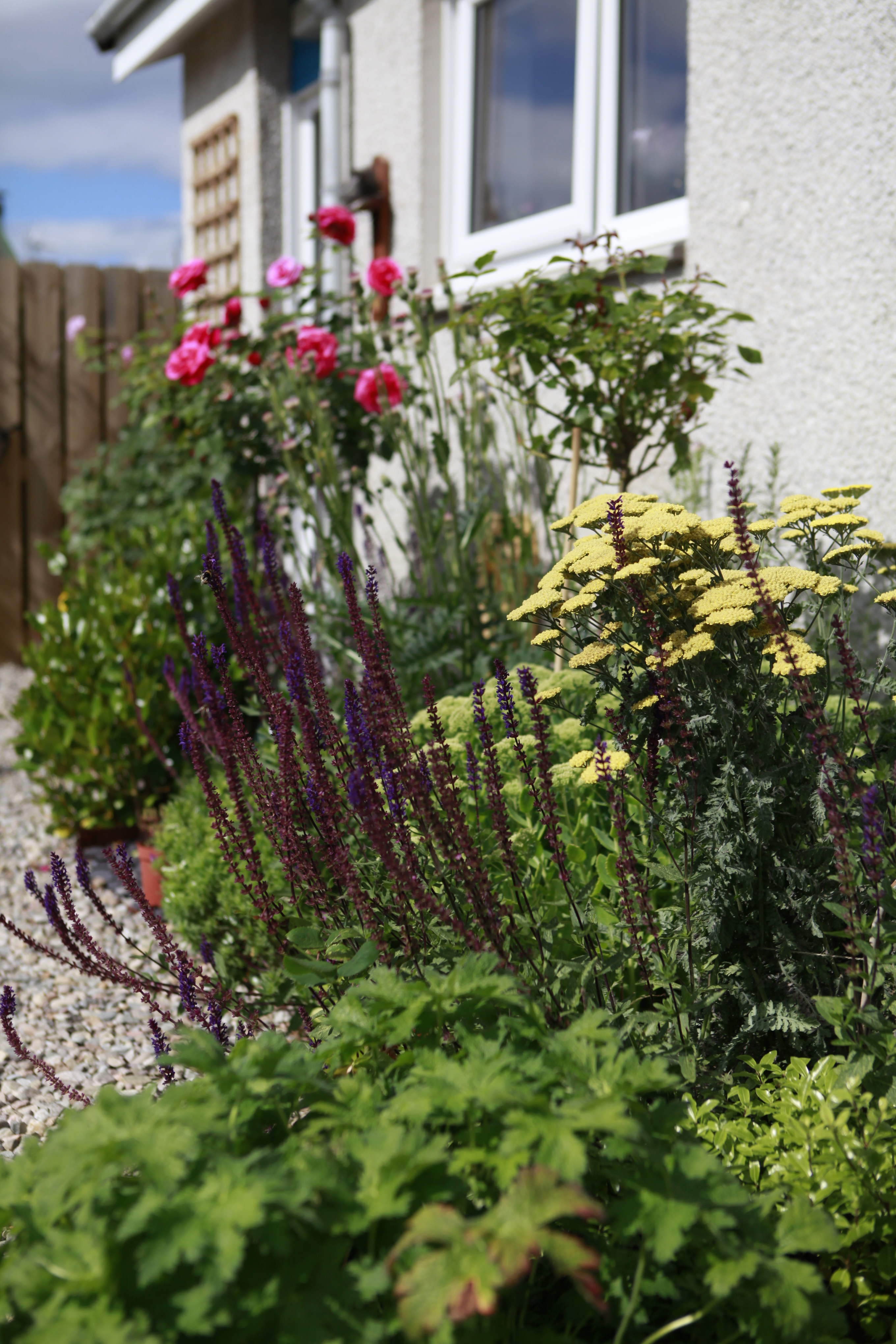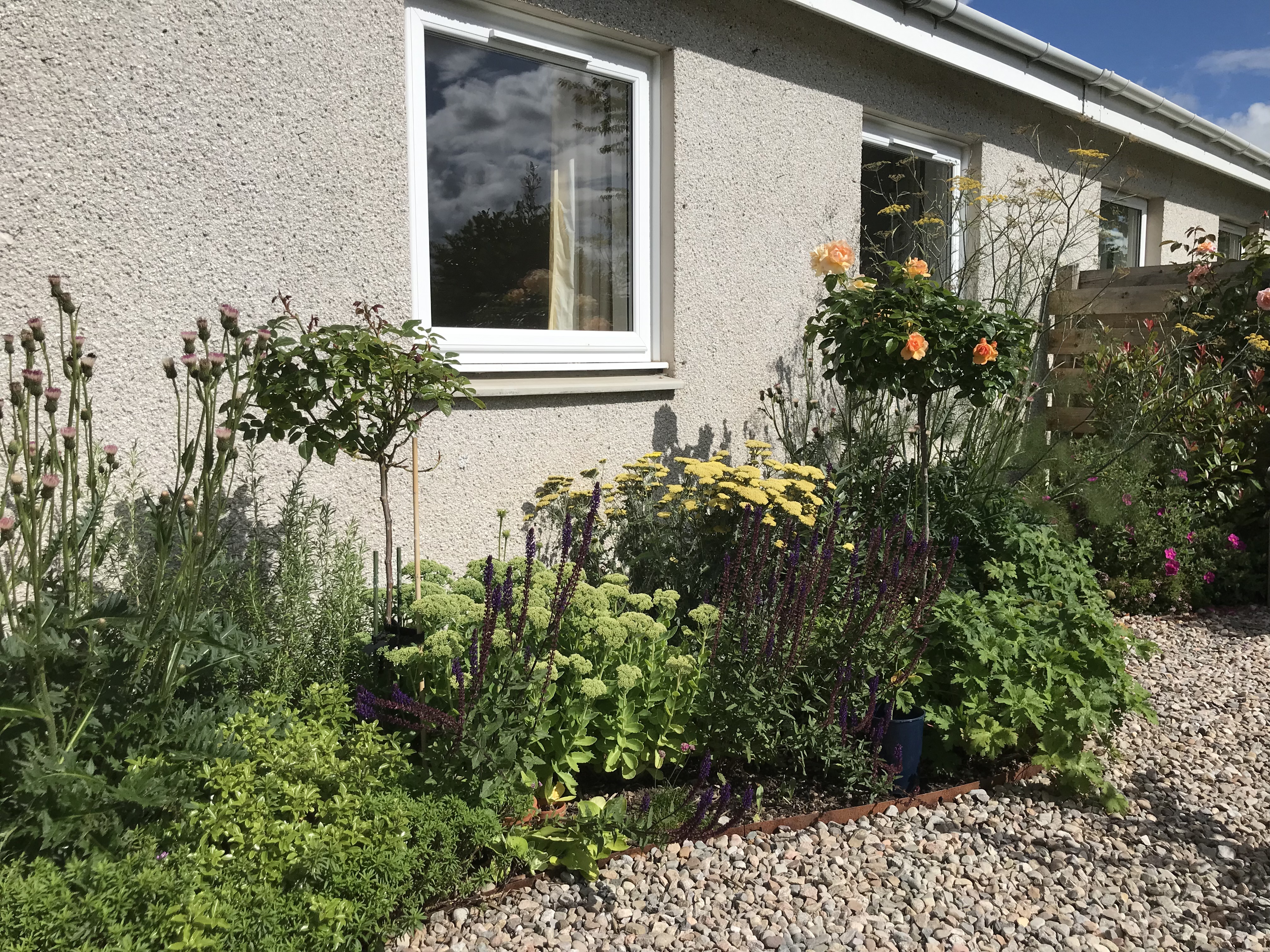 Some repetition is visible here with the amazing Erigeron karvinskianus, Ajuga reptans and various types of Thyme. Other strong plants include Fuchsia magellanica, a few different varieties of the trusty Hebe and Festuca grass. The roses we chose were the robust Queen Elizabeth. A couple of tall, fastigiate, evergreen conifers will add height to the scheme in the future.