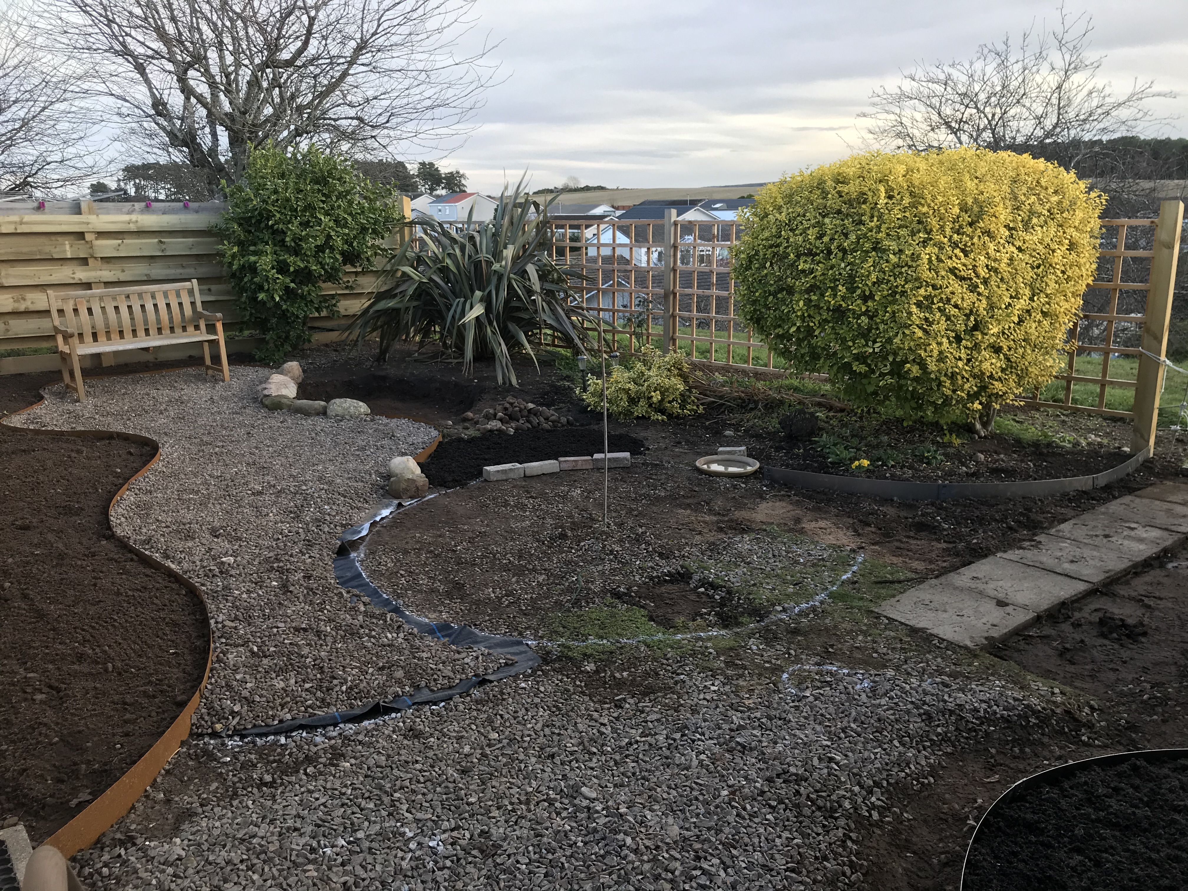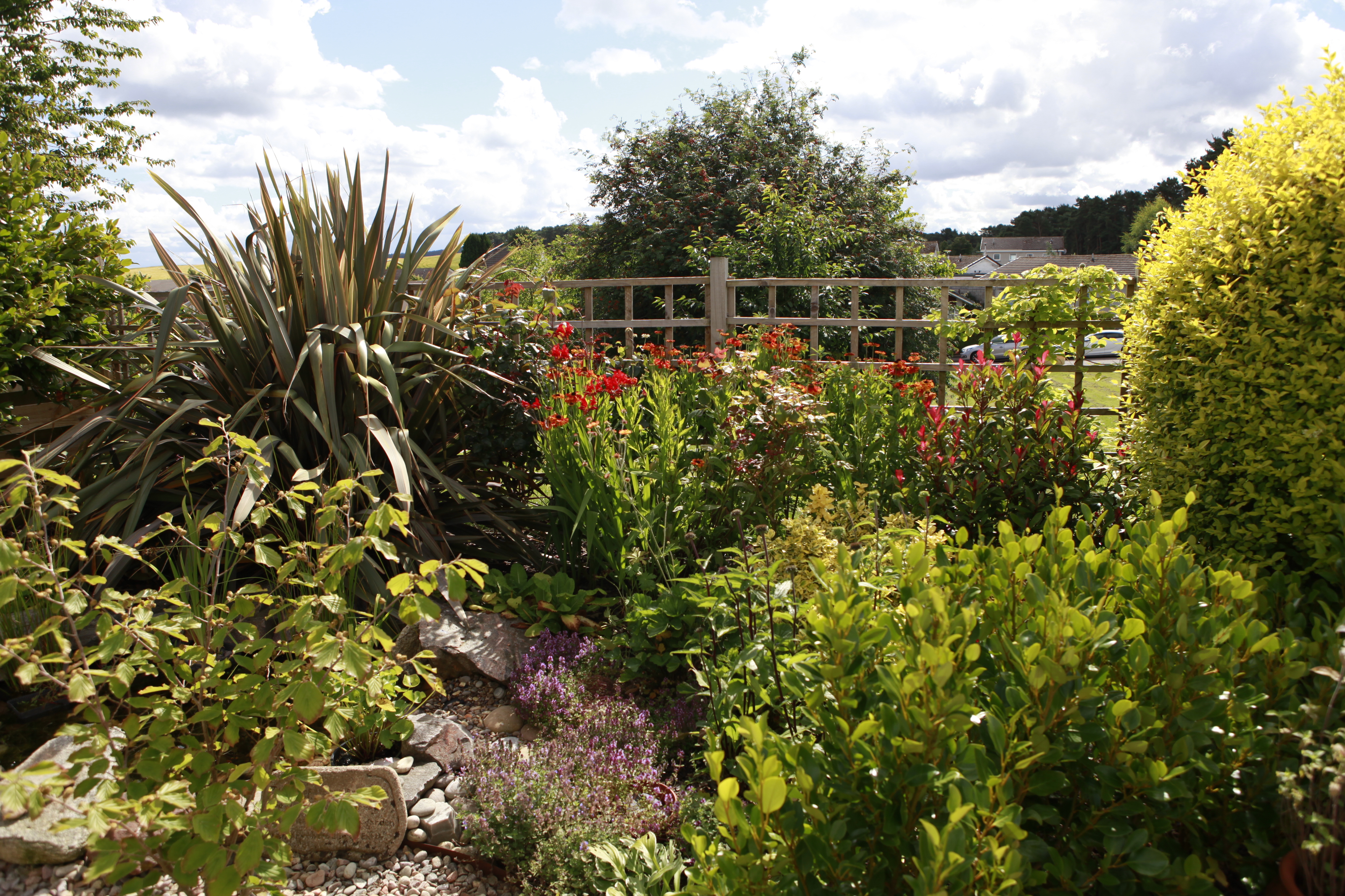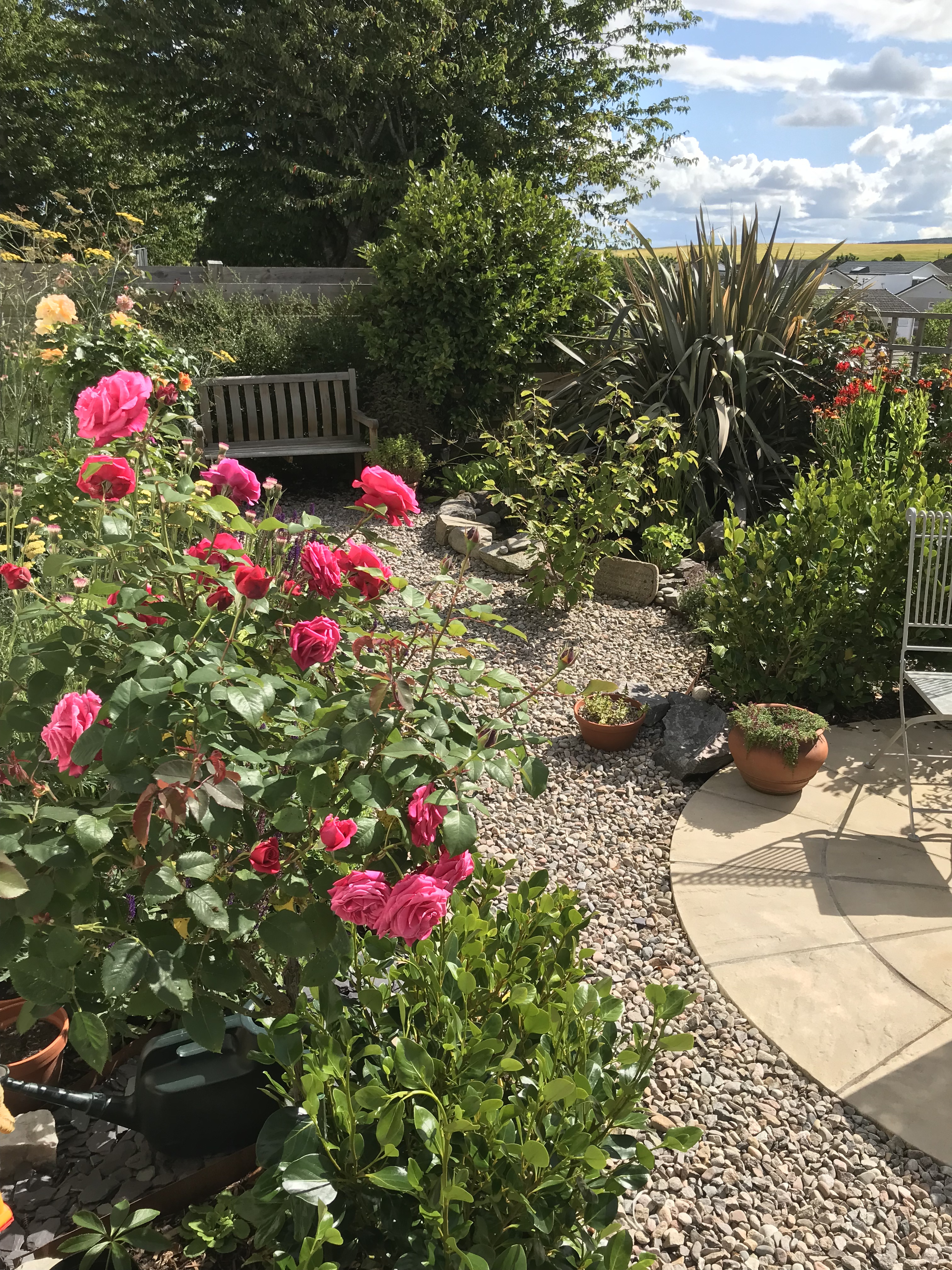 This garden has been created entirely from scratch after some groundworks including adding a large draining ditch to help alleviate the excessive winter wet. I vividly recall all the mud that was there before! The large rockery in the middle is the centre piece, with a rose garden to the left, a gravelled seating area at the top to overlook the planting, and a rustic stone path leading to the front of the house with shrubbery and more formal grass planting to soften the hard landscaping.