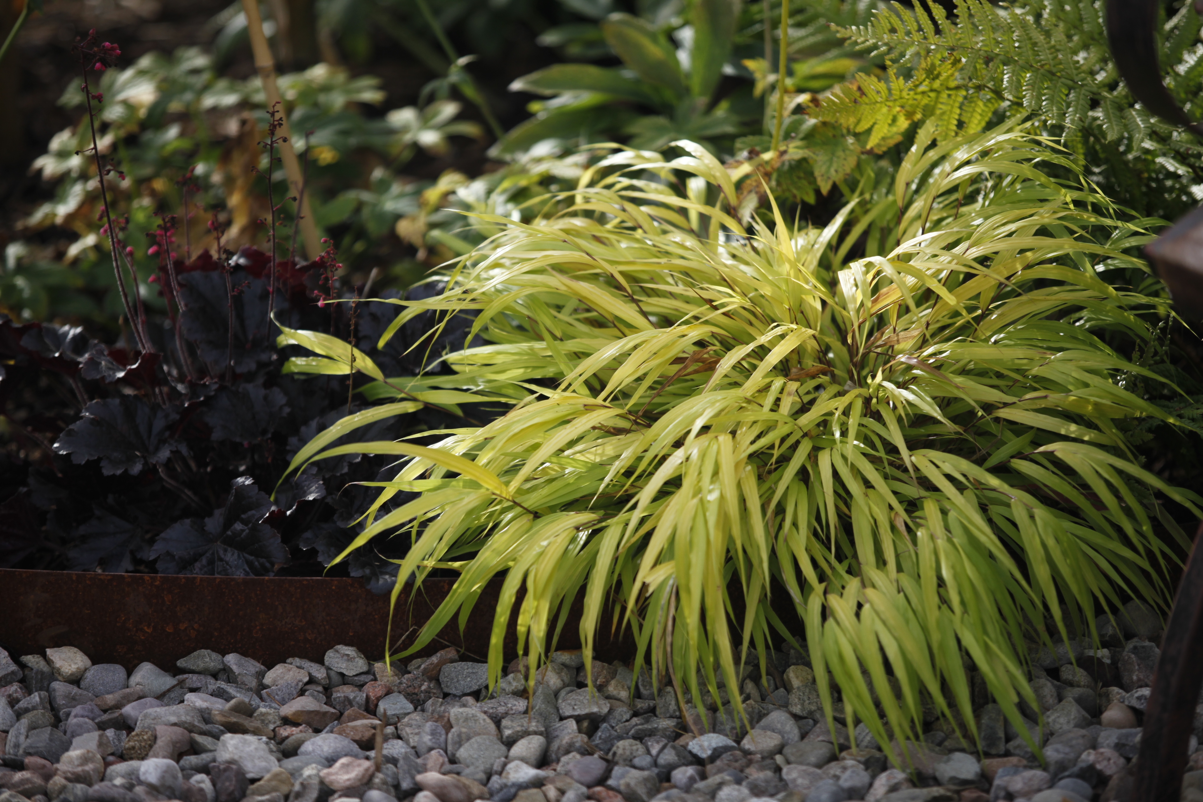 Some mature specimen trees / shrubs add structure and the addition of grasses brings the element of movement and interest.